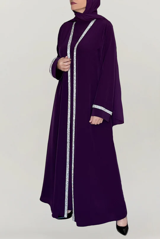 Luxury Purple Abaya with Silver Embellished Trim – Elegant Modest Wear for Women